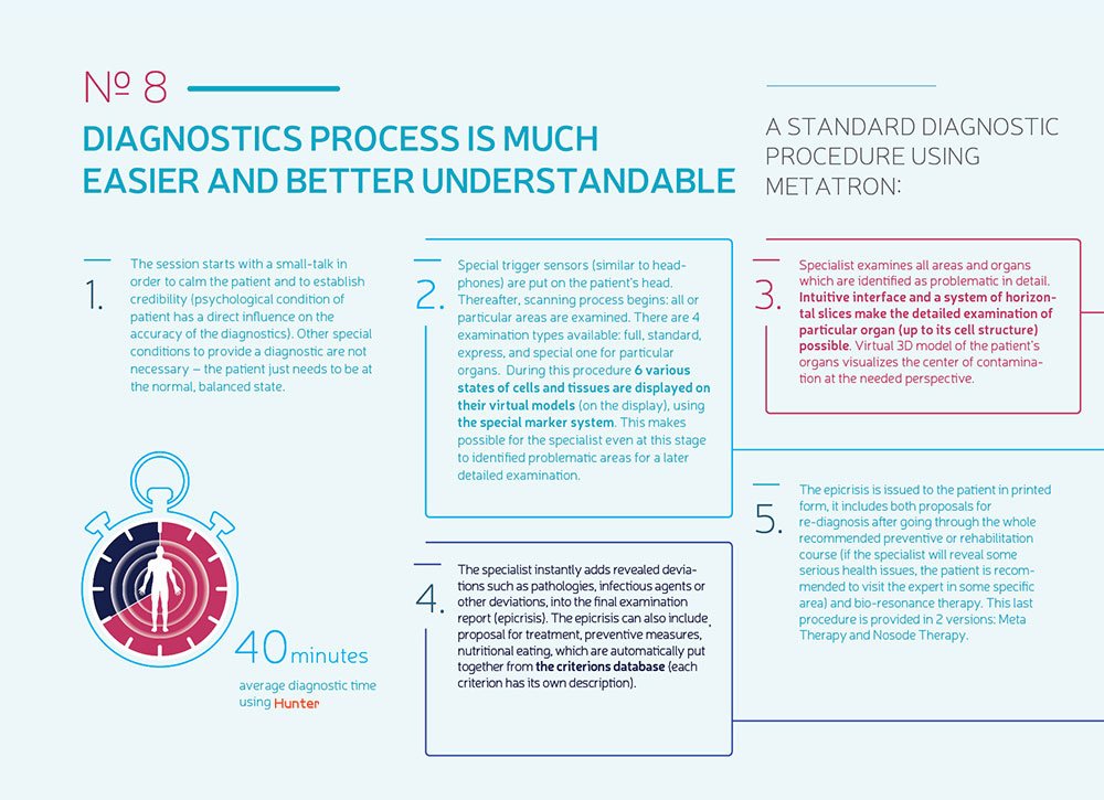 8D LRIS has been developed in Russia, and is a revolutionary invention. 8D LRIS is a machine for data contro lled diagnosis and treatment, and is a result of many years co – operation between Russian scientists and medical doctors. 8D LRIS diagnostics show the different defects and pathological changes in human organs and tissues.The method is based on an analysis of the brain stems electromagnetic waves which contain the complete information of the entire organism. This information is read by a sensor. A frequency transmitter aimed at the projection area of the brain stem stimulates this electromagnetic radiation.