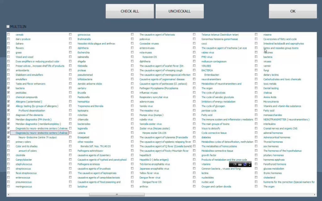 8d-lris-nls health scanner-The program contains lots of pathological processes’ graphs with all progressive stages shown with age, sex and other variations taken into account. After reading the frequency characteristics of biological object under investigation, the system compares the degree of their spectral similarity with healthy or pathology affected tissue or infection agency to obtain the closest pathological process or tendency. In case the processes are similar, virtual diagnosis mode allows carrying out of differentiated diagnosis of each process.