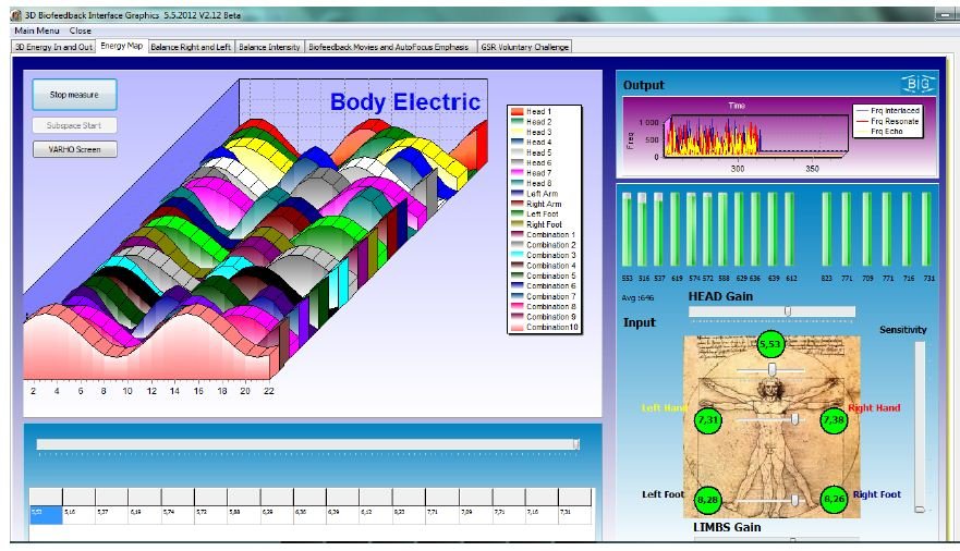 The biofeedback system utilizes five comfortable straps with sensors that measure frequencies on the wrists, ankles and forehead. It is able to measure almost 10,000 different substances, which commonly interact in the body. These substances include vitamins, amino acids, minerals, enzymes, toxins, hormones, muscles, bacteria, molds, fungi, viruses, allergens, emotions, and the stress of the internal organs. It measures electromagnetic waveforms (also called frequencies) and determines imbalances by comparing the figures against a “norm”.